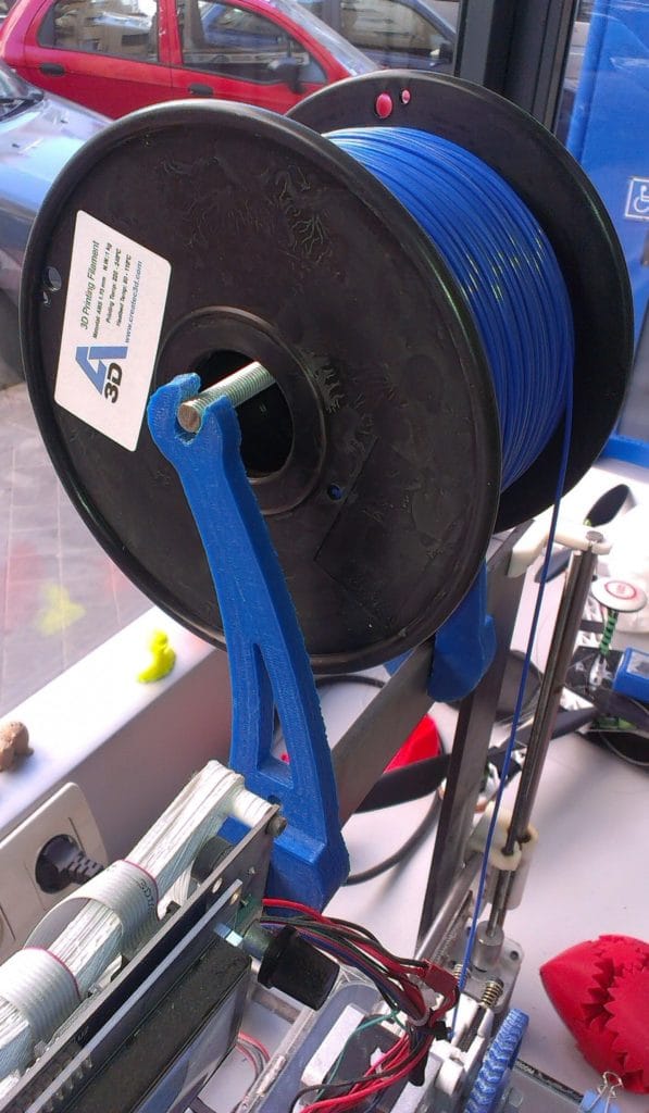 Universal stand-alone filament spool: este soporte, totalmente giratorio e imprimible en 3D, puede contener cualquier carrete de filamento. Su filtro hará que nuestro filamento siempre esté limpio y lubricado y gracias a sus rodamientos impresos en 3D y un tubo guía, el filamento estará en la posición correcta para dirigirse directamente hacia el extrusor.