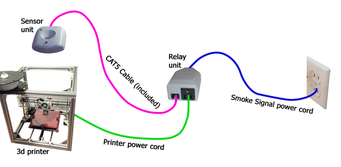 Este dispositivo tiene un sensor de humo que, en caso de fuego, interrumpe el circuito entre una impresora 3D y la toma de corriente. Este sistema se coloca cerca de la zona de impresión donde se pueda detectar el humo fácilmente antes de que el fuego se convierte en tragedia.